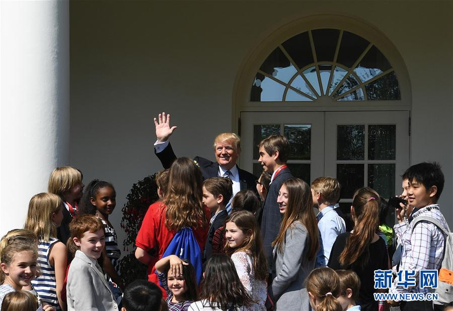 4月27日,在美國華盛頓白宮玫瑰園,美國總統特朗普(中)和參加活動的孩子們打招呼。