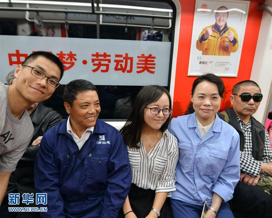 5月1日,全國勞模吳曉紅(右二)、劉志堂(左二)在“勞模地鐵專列”車廂內與乘客合影。 “五一”勞動節期間,一列“勞模地鐵專列”亮相長沙地鐵1號線。該列車在車廂內集中展示了由全國勞模、攝影家謝子龍拍攝的88位不同崗位全國勞模的肖像作品,旨在展示“勞動最光榮、勞動最崇高、勞動最偉大、勞動最美麗”的精神。新華社發(陳思維 攝)