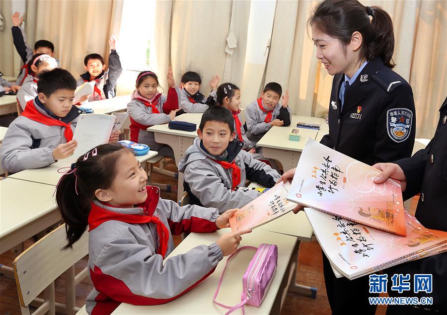 2月23日,上海市公安局徐匯分局徐家匯派出所民警黃雯怡(右一)向匯師小學(xué)學(xué)生發(fā)放公共安全教育教學(xué)補(bǔ)充讀本。當(dāng)日是上海中小學(xué)開(kāi)學(xué)第一天,由上海市公安局和市教委在現(xiàn)有教材基礎(chǔ)上組織編撰的6冊(cè)全新的公共安全教育教學(xué)補(bǔ)充讀本被發(fā)放到中小學(xué)和幼兒園,供教師教學(xué)參考使用。新華社記者 凡軍 攝