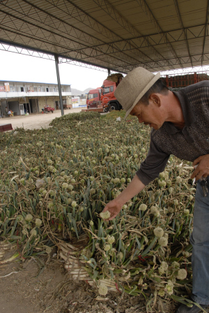 洋蔥的價格從兩周前的每斤0.60元一下子跌到每斤0.15元,這讓批發商韓先生始料未及。
