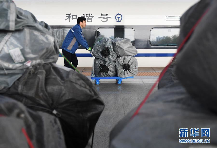 11月11日,工作人員在蘭州西站將快遞包裹裝上D2711次動(dòng)車組列車。 -