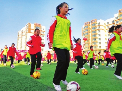 11月30日,2017年國際足聯(lián)——追夢女孩足球節(jié)活動在蘭州新區(qū)第五小學(xué)拉開帷幕。200多名3至6年級的女學(xué)生在老師的指導(dǎo)下,通過開展手拉手傳球接力賽、協(xié)調(diào)性控球、射門接力賽、趣味顛球賽、五人制足球比賽、親子足球賽等活動,在綠茵場上享受足球運(yùn)動帶來的快樂。
