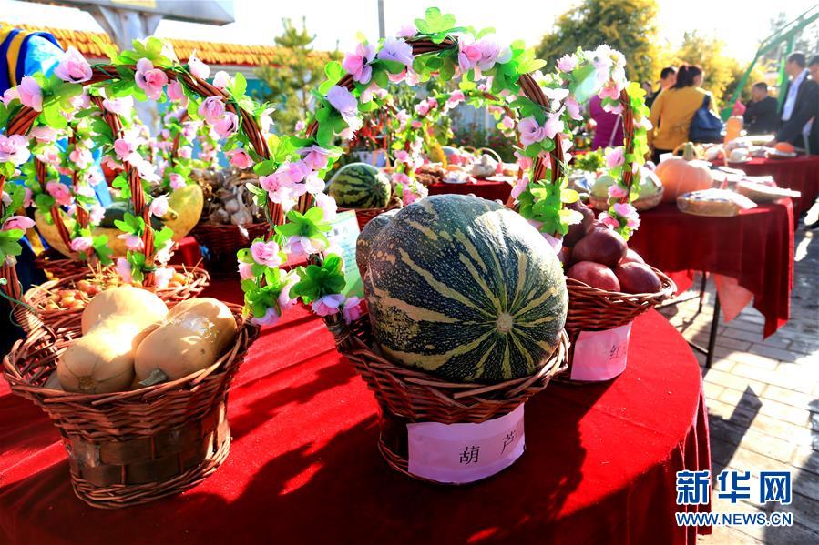 這是9月21日拍攝的展出的特色農產品。 當日,甘肅省張掖市甘州區首屆農民豐收節在明永鎮燎煙村舉行,村民們載歌載舞,參加各種趣味比賽,歡慶豐收。新華社發(陳禮 攝) -