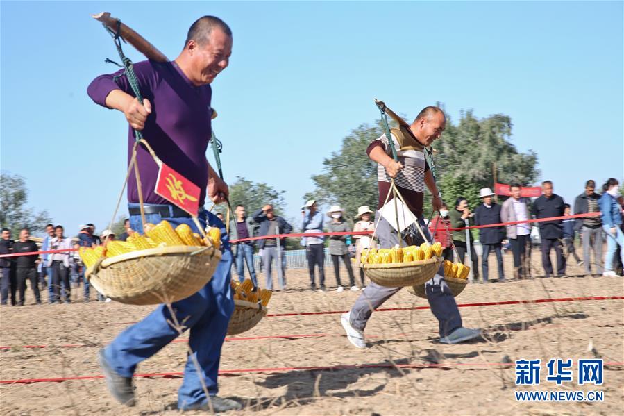 9月21日,村民參加挑玉米往返接力賽。 當日,甘肅省張掖市甘州區首屆農民豐收節在明永鎮燎煙村舉行,村民們載歌載舞,參加各種趣味比賽,歡慶豐收。新華社發(王將 攝) -