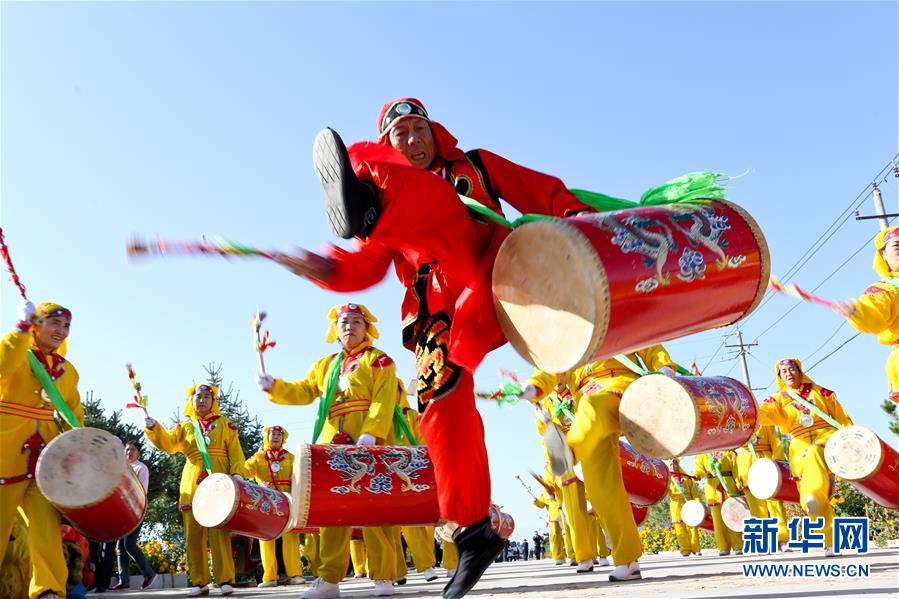 9月21日,村民在活動中敲太平鼓。 當日,甘肅省張掖市甘州區首屆農民豐收節在明永鎮燎煙村舉行,村民們載歌載舞,參加各種趣味比賽,歡慶豐收。新華社發(王將 攝)