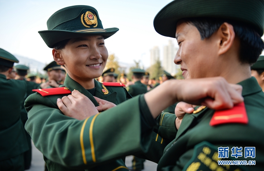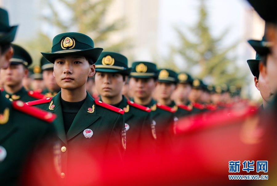 11月20日,武警甘肅省總隊各新訓大隊舉行新兵授銜儀式。經(jīng)過兩個多月的部隊教育、訓練和學習,新兵們初步完成由普通社會青年向軍人的轉(zhuǎn)變,被光榮授予列兵軍銜,正式成為武警戰(zhàn)士。新華網(wǎng)發(fā) (侯崇慧 攝)