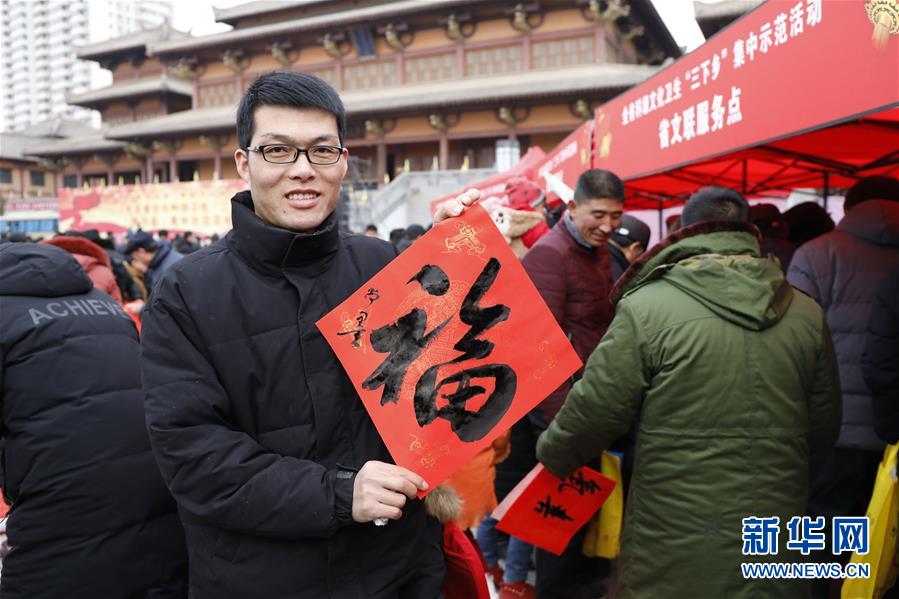 1月15日,在靜寧縣成紀(jì)廣場,市民在展示福字。 當(dāng)日,甘肅省2019年文化科技衛(wèi)生“三下鄉(xiāng)”集中示范活動在甘肅省靜寧縣舉行,文化、醫(yī)療和科技工作者為當(dāng)?shù)厝罕娝腿ベN心服務(wù)和新春祝福。 新華社發(fā)(張智敏 攝) -