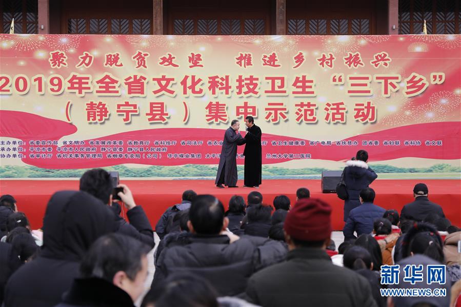 1月15日,在靜寧縣成紀(jì)廣場,當(dāng)?shù)厝罕娫谟^看相聲表演《戲說鄉(xiāng)音》。 當(dāng)日,甘肅省2019年文化科技衛(wèi)生“三下鄉(xiāng)”集中示范活動在甘肅省靜寧縣舉行,文化、醫(yī)療和科技工作者為當(dāng)?shù)厝罕娝腿ベN心服務(wù)和新春祝福。 新華社發(fā)(張智敏 攝) -