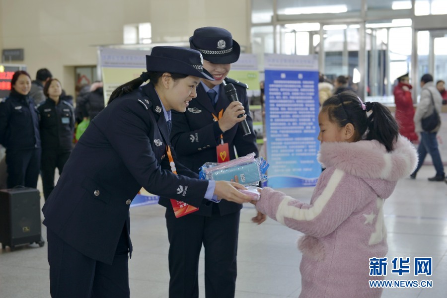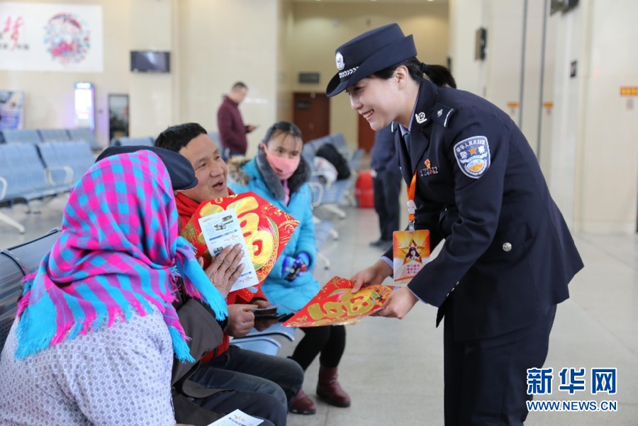 1月21日,蘭州鐵路公安局武威公安處民警向旅客贈送對聯。當日,2019年鐵路春運大幕正式拉開,蘭州鐵路公安局武威公安處在轄區車站開展以“平安、有序、溫馨”為主題的宣傳活動,出動警力500余人次,在轄區金昌站、張掖站、嘉峪關南站、酒泉南站、敦煌站等28個客站設立安全宣傳服務點,向旅客普及實名制購票安全、火車出行安全防范知識、危險品知識,并現場送祝福送對聯,提供法律咨詢服務,切實提高旅客自身安全防范意識,護衛旅客平安回家路。新華網發(劉東帥 攝) -