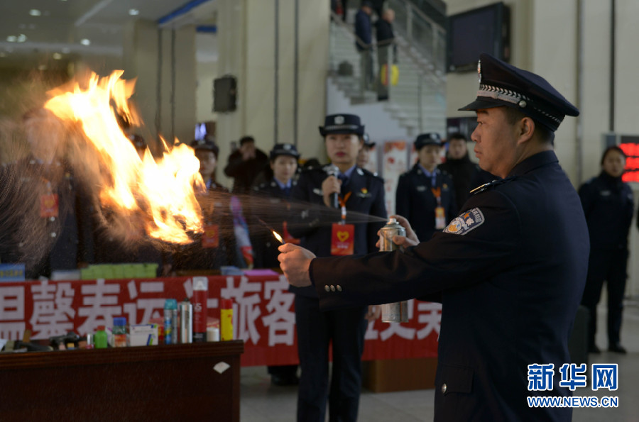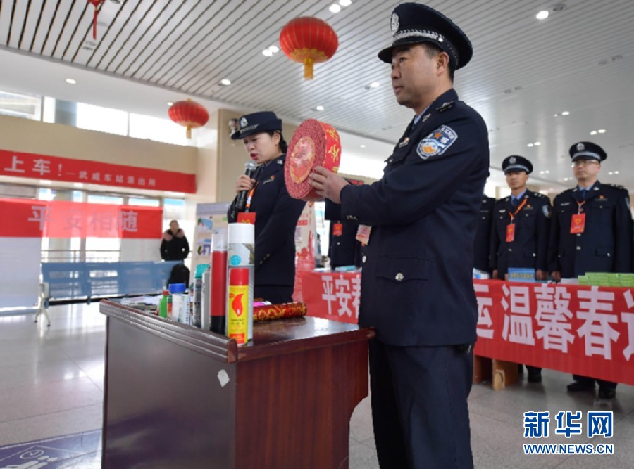 1月21日,蘭州鐵路公安局武威公安處民警現場演示限制攜帶物品的危險性。新華網發(劉東帥 攝) -