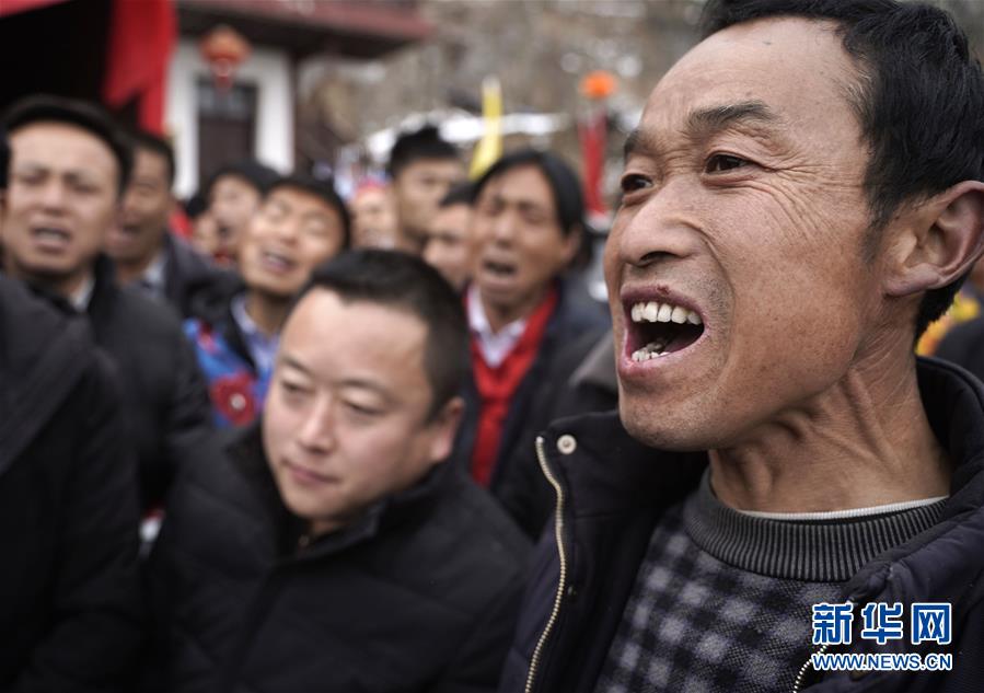 •      2月19日,在甘肅省隴南市武都區馬街鎮姜家山村,幾名男子在社火隊表演時大聲唱起當地的歌謠。新華社記者才揚 攝