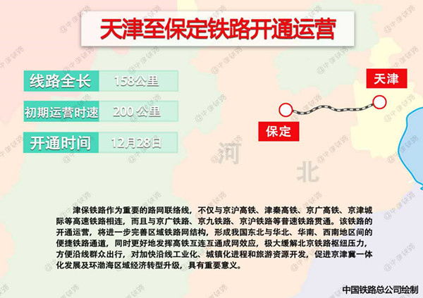 央廣網北京12月27日消息(記者何微)記者從中國鐵路總公司獲悉,12月28日,天津至保定鐵路開通運營,天津到保定的運行時間將由原來的2小時36分壓縮至1小時左右,東北到華北、華南、西南地區間的運行時間也將大幅度壓縮。