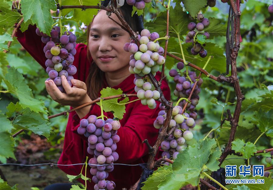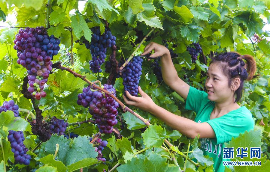 8月14日,在河北永清縣三圣口鄉冰窖村,游客在采摘葡萄。河北省永清縣三圣口鄉冰窖村是該縣有名的葡萄種植專業村。近年來,該村大力推廣引進葡萄種植新技術、新品種,引導農民種植錯季葡萄,實現了每年4月至9月都有不同品種的葡萄上市。目前全村種植葡萄5000余畝,年產值達3000余萬元。新華社記者李曉果 攝 -