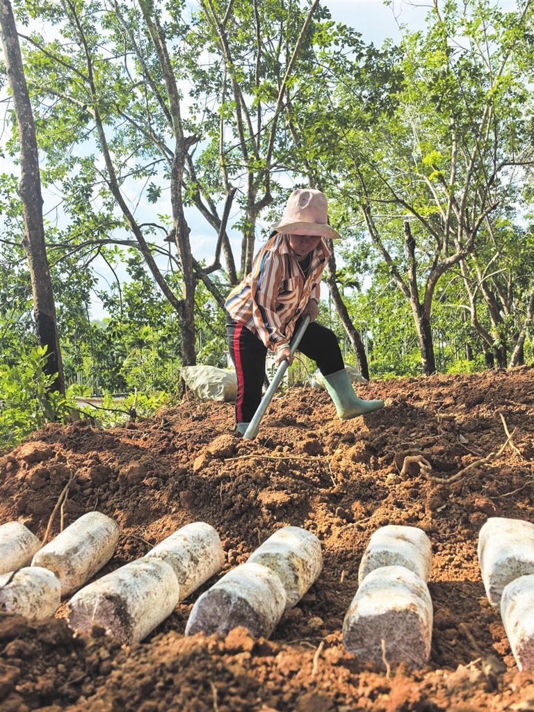 清晨的陽光透過橡膠樹葉的縫隙,灑在種植基地里,村民陳彩麗和工友們正忙著擺放菌棒,手里的活兒有條不紊。