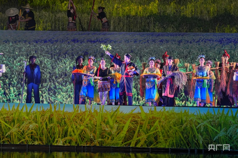 午后,活動主場轉移至牙叉鎮的稻作文化公園。15時,稻作文化公園內的主會場啟幕儀式上,一條融合黎族風情與豐收意象的“豐收大道”格外亮眼,盛裝的黎族同胞向嘉賓敬獻山蘭美酒與特色IP文創產品,寓意共赴豐收之約。公園稻田中,全國農民“大地藝術展”吸引眾多目光,80幅優秀農民畫作以天地為幕、稻田為席,將農耕文化與自然之美融為一體,為游客帶來視覺與心靈的雙重滋養。