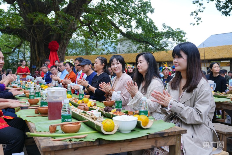 正午時分,古樹廣場上用芭蕉葉鋪就的餐桌,竹筒剖開成器,牛肉干、溪魚干、三色飯、五腳豬等黎家美食散發原生態香氣,“嘞樂”黎族音樂的旋律伴著歡聲笑語回蕩。“這是最地道的黎家味道!”來自海口的游客王女士邊拍照邊笑稱:“得讓朋友圈先‘嘗鮮’!”不遠處的消費助農大集市里,山蘭米、米酒、非遺文創產品成游客首選,不少人拎著滿載的特產感慨“不虛此行”。
