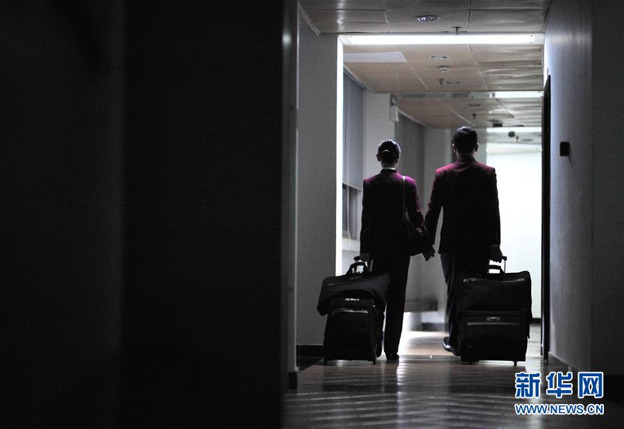 2月1日,在南航海口美蘭基地,寧儒(右)和梁鶴手牽手一起執行航班任務。新華社發(楚洪雨 攝) -