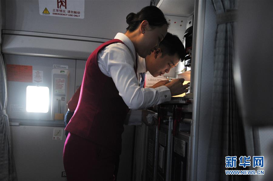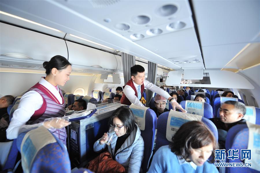 2月1日,寧儒和梁鶴在航班上為乘客服務。新華社發(楚洪雨 攝) -
