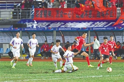 11月29日,“啟航自貿港”第一屆海南省城市足球聯賽開幕式和揭幕戰在海南體育職業技術學院舉行,東道主?陉1:2負于儋州隊。當日其他比賽中,三亞隊3:0戰勝陵水隊,瓊海隊3:0戰勝臨高隊,保亭隊2:0戰勝了五指山隊。圖為海口隊與儋州隊比賽現場。( 記者王黎剛 封爍)