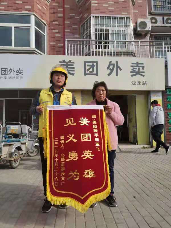 10月26日,河南省周口市沈丘縣美團外賣配送中心站的90后騎手連亞飛,在送餐途中路過沈丘蔡河橋西邊時,發現一騎三輪車婦女突然失控,大人小孩連人帶車一起掉到河里,他奮不顧身跳入河中救起2人。救人的事跡傳開后,連亞飛成了方圓數里的“紅人”,10月28日,共青團沈丘縣委授予他“見義勇為好青年”榮譽稱號,美團外賣平臺授予他“模范騎手”榮譽稱號和800元現金獎勵。