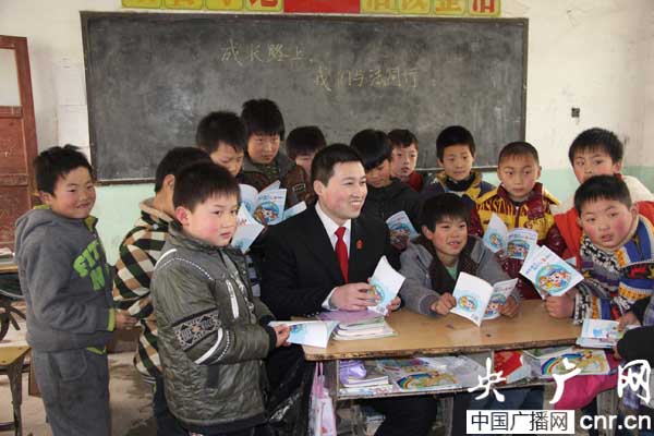 央廣網河南分網消息 安陽市殷都區人民法院正在開展“保護農村留守婦女、留守兒童、留守老人的合法權益”專項活動,為了幫助孩子們的成長,日前,殷都區人民法院少年法庭的法官們不顧路途偏遠,在該院領導的帶領下來到內黃縣一所有20多名留守兒童學生的龍莊村小學,為這里的孩子們送來150多本法律知識課外讀物,并以講解寓言、童話、故事的方式上了一堂生動的法制教育課。