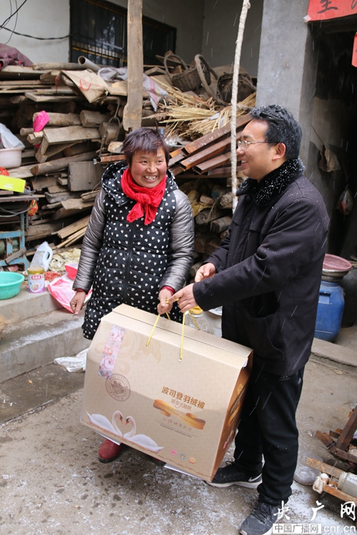 貧困戶張滿才接到扶貧干警送的羽絨被,熱淚盈眶:“非常感謝黨和政府的關(guān)心,這么冷的天能把我們的溫暖掛在心頭,我一定努力脫貧,不辜負(fù)大家的期望。”