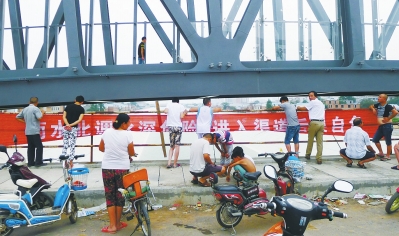 8日下午6時(shí)許,記者在南水北調(diào)焦作段政二街過(guò)渠大橋上看到,不少垂釣者用根海桿伸向南水北調(diào)干渠里釣魚(yú),橋上的西側(cè)聚了許多看稀罕的人,機(jī)動(dòng)車(chē)道上停了許多電動(dòng)車(chē)和3輛轎車(chē),幾乎占?jí)簷C(jī)動(dòng)車(chē)道的三分之一路面(上圖),路中央疾駛的車(chē)輛路過(guò)這里只好橫壓黃線才能通過(guò)。