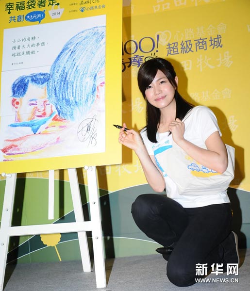 9月18日,陳妍希在臺(tái)北第三屆“幸福袋著走”公益活動(dòng)記者會(huì)上義賣自己的畫作《背背》。