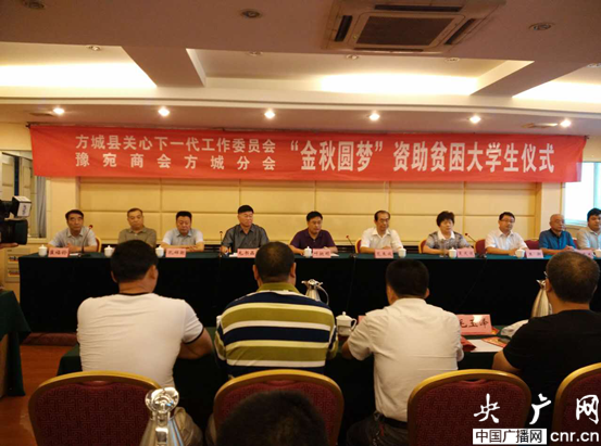 央廣網河南分網消息 8月18日,在河南省方城縣關工委、豫宛商會方城分會“金秋圓夢”資助貧困大學生活動儀式上,來自方城縣的57名貧困大學生每人領到了3000元的“愛心圓夢大學”助學金。方城縣縣委副書記葉挺碩,方城縣委常委、組織部部長潘自欽,方城縣政府副縣長馬偉,方城縣關工委執行主任夏天俊等出席捐贈活動。