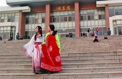 昨天下午,農大圖書館前,大學生們三五成群坐在臺階上看書,中間兩個穿著漢服的女孩特別引人注目。“經常看到她們這樣穿。”“作秀吧!”“在排練情景劇?”學生們對此似乎見怪不怪,但都說不出她們到底在干什么。說話間,兩名“漢服女孩”起身,一路聊一路走著,校園林蔭道、教室里、小河邊,兩人的出現成了一道獨特的風景,每到一處立馬引來同學們的目光。