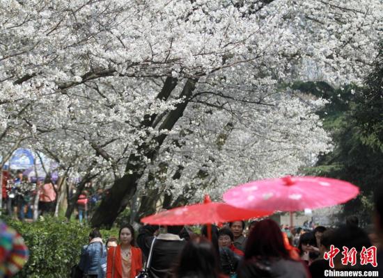 陽春三月,武漢春意濃,游客在武漢大學校園內觀賞綻放的櫻花。(資料圖)