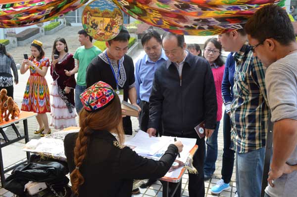 參觀中,校黨委書記張中華認真聽、看和詢問各民族所展示的動人神話傳說、珍藏典籍、特色民族服飾、民族文字和繪畫作品,品嘗各民族特色傳統美食。當他走到哈薩克族的展示區時,哈族的一對姑娘、小伙兒正在現場模擬民族結婚嫁娶習俗,一對“新人”盛情邀請他做“主婚人”,親身體驗和感受民族婚嫁文化。