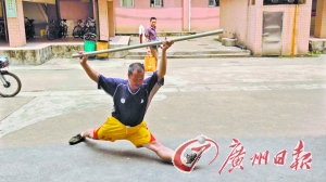 黃師傅在劈腿耍長棍。