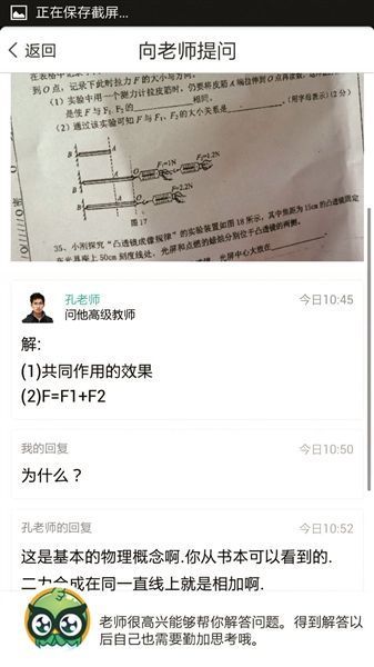 一款較為火爆的解題神器——“問他作業(yè)”,進(jìn)入應(yīng)用主頁后,頁面上顯示“我要提問”的指示圖標(biāo),點(diǎn)擊進(jìn)入后,有兩個(gè)“提問方式”供選擇,一為“向?qū)W霸提問”,二為“向老師提問”,記者點(diǎn)選了“向老師提問”,上面注明需“付費(fèi)”,記者注冊(cè)并充值后進(jìn)入正式提問頁面,需填寫“選擇年級(jí)和學(xué)科”后,“上傳圖片或輸入問題”。記者隨機(jī)拍了一道初二物理“力學(xué)”試題上傳,5分鐘后一位標(biāo)注為“問他高級(jí)教師”的孔老師給了答案,答案中沒有任何解析說明。記者隨后點(diǎn)了回復(fù),提問“為什么?”孔老師2分鐘后回復(fù),“這是基本的物理概念啊,你從書本可以看到的,二力合成在同一直線上就是相加啊。”整個(gè)解題結(jié)束后,系統(tǒng)提醒“是否采納答案”,點(diǎn)擊“采納”后,扣除了2個(gè)問豆,即2塊錢。