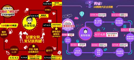 在京美大戰前期,國美在線推出32億現金券PK京東16億優惠券,隨后聯合百度推出1分錢換6聽啤酒暢飲世界杯活動,京東則推出0元玩轉萬達活動,“免費”成為了二者這個促銷階段的共同之處。進入6月之后,國美在線提前截流京東3C大促,推出手機電腦真低價活動,時間比京東提前了1天。接下來,二者主打的品類皆為家電、服裝,最后,雙方最高層領導將為自家商城站臺,以“老牟專場”與“老劉專場”的對決形式展現。