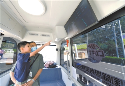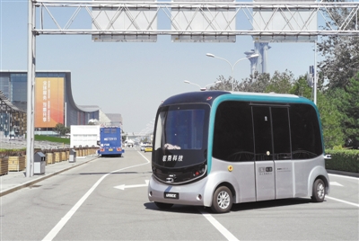 上圖 在展會特別開辟的無人駕駛體驗區(qū)內(nèi),馭勢科技自主研發(fā)的新一代無人駕駛小巴為中外賓客提供接駁服務(wù)。