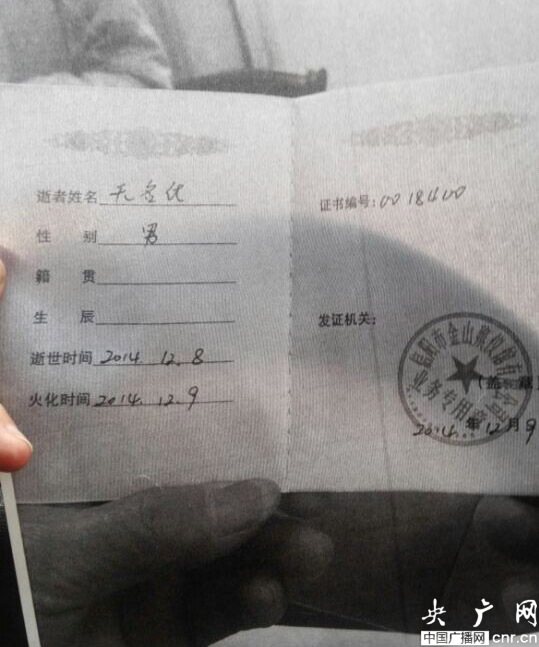 而火化證明上顯示:“逝者姓名為無名氏,逝世時間是12月8日,9日火化。”何文說,自己到殯儀館去拿骨灰盒的時候,工作人員剛開始給自己開了一個58號,隨后對方讓自己稍等一下,等了約20分鐘后卻給了自己一個61號,當何文要求文字根據(jù)的時候,對方直接給自己開了一個火化證明。