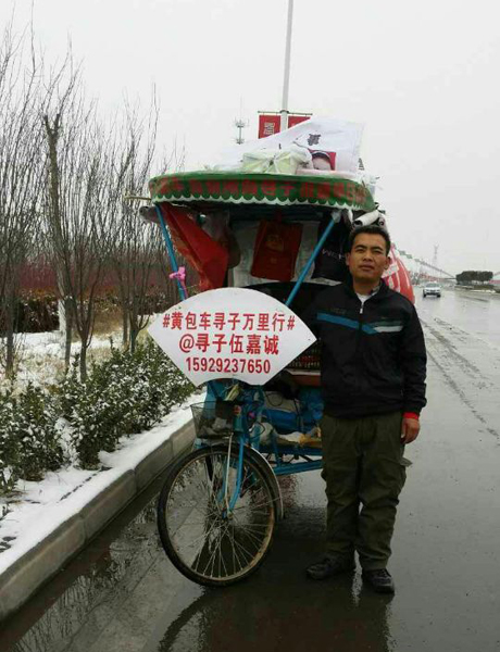 伍興虎跑遍中國的交通工具是一輛人力三輪車,車身上寫著“尋人啟事”、“黃包車萬里尋子”等字樣。車上還放著《寶貝回家》的歌曲。他將印有防拐知識的尋子傳單發給圍觀群眾。