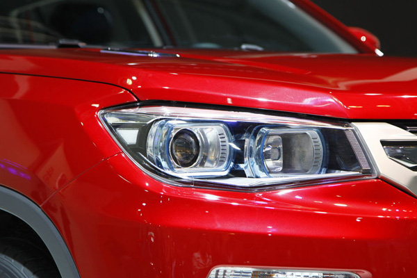 進氣格柵的形狀見棱見角,大橫幅的設計看起來立體感十足。關鍵是畫龍點睛的雙筒形前大燈(氙氣大燈),也讓前臉顯得炯炯有神。比較特別的是,CS75并沒有采用長安傳統的“V”型LOGO,而是直接將“CHANGAN”的拼音作為標識。當然,這一點也并非長安首創,在其它硬派SUV中也屢見不鮮。
