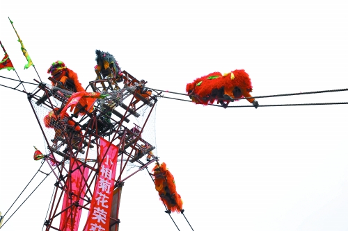 十幾米的高臺(tái),四周用繩子牽引,獅子就利用繩子爬上高臺(tái)。隨著上面“板叉”“頭扛尾”“倒立”等驚險(xiǎn)表演,臺(tái)下不時(shí)發(fā)出驚呼聲,孩子們都看得目不轉(zhuǎn)睛,許多人拿著手機(jī)拍照,附近居民樓上許多人從窗戶(hù)里探身往外看。