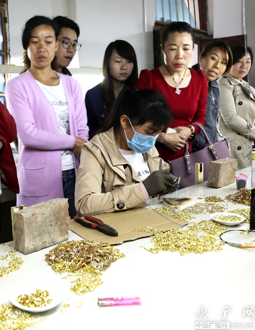 5月3日,河南寶豐13個鄉(xiāng)鎮(zhèn)、林站的婦女代表在前營鄉(xiāng)岳墳溝村參觀學(xué)習(xí)制作鍍金胸花和首飾技術(shù)。