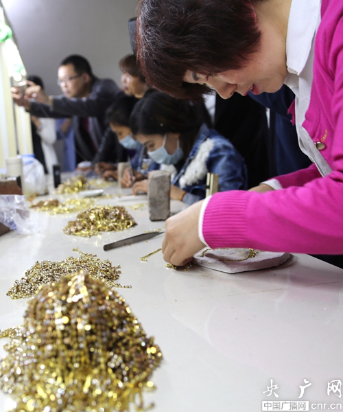 5月3日,河南寶豐前營鄉(xiāng)岳墳溝村留守婦女在制作鍍金胸花和首飾。
