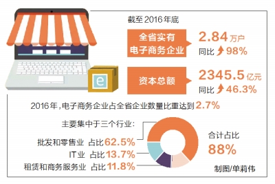 2016年,電子商務(wù)企業(yè)占全省企業(yè)數(shù)量比重達(dá)到2.7%,較上年同期提升1個(gè)百分點(diǎn)。全省電子商務(wù)企業(yè)主要集中于批發(fā)和零售業(yè)、IT業(yè)、租賃和商務(wù)服務(wù)業(yè)三個(gè)行業(yè),占比分別為62.5%、13.7%和11.8%,合計(jì)占比88%。