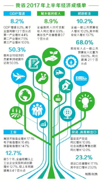 金融市場運行平穩。穩妥有序推進去杠桿,國有企業債務風險得到初步防控,今年5月底,省管企業資產負債率同比下降0.5個百分點;6月末,金融機構人民幣貸款余額增長16.5%,比一季度提高0.3個百分點,全面提升金融服務實體經濟的效率和水平。