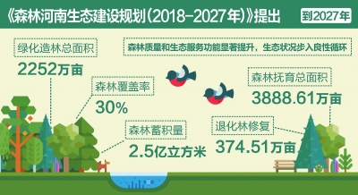 根據《森林河南生態建設規劃(2018-2027年)》評審稿,未來10年,我省對國土綠化、資源保護、森林質量提升、森林城市建設、綠色富民產業等內容將進行全面規劃,著力構建“一核一區三屏四帶多廊道”的總體布局。其中,“一核”為鄭州大都市生態區;“一區”為平原生態涵養區;“三屏”為太行山地生態屏障、伏牛山地生態屏障、桐柏—大別山地生態屏障;“四帶”為沿黃生態涵養帶、南水北調中線水源地及干渠沿線生態涵養帶、沿淮生態保育帶和大運河及明清黃河故道生態保育帶;“多廊道”為以鐵路、公路、河流等組成的生態廊道網絡。到2027年,規劃國土綠化造林總面積2252萬畝,森林撫育總面積3888.61萬畝,退化林修復374.51萬畝。到2022年,森林覆蓋率達到27.5%,森林蓄積量達到2.1億立方米;到2027年,森林覆蓋率提高到30%,森林蓄積量達到2.5億立方米,森林質量和生態服務功能顯著提升,生態狀況步入良性循環。