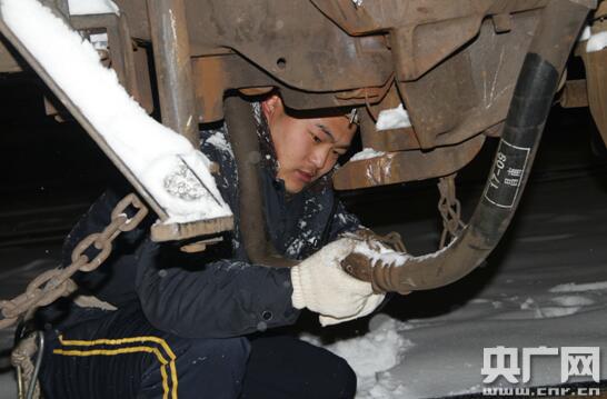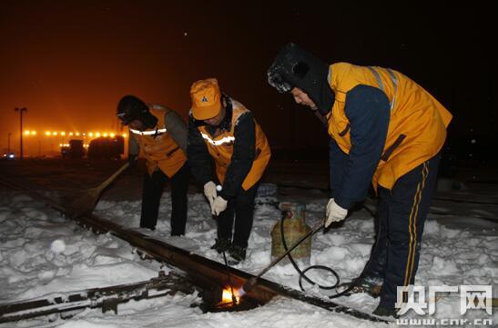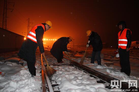 央廣網(wǎng)河南分網(wǎng)1月9日消息 近期受強冷空氣影響,豫南地區(qū)連降兩場大雪,室外溫度也低至零下10度,為確保惡劣天氣下運輸暢通,武漢鐵路局漯河火車站以雪為令,組建打冰除雪突擊隊晝夜堅守一線,不間斷地對站區(qū)道岔、廣場、站臺等關鍵處所進行清掃、涂抹防凍液。