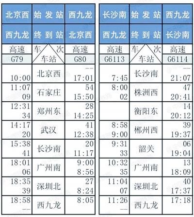 北京西到香港西九龍高鐵列車時刻表
