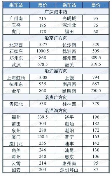內地部分車站至香港西九龍二等座票價表(人民幣)