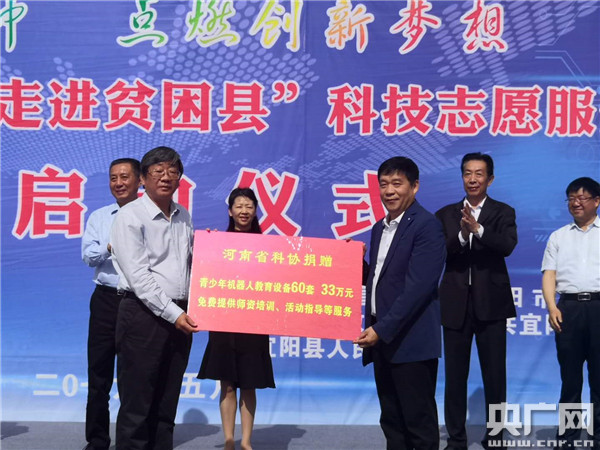 啟動(dòng)儀式上,房衛(wèi)平、吳廷偉、賀敏等為開展“科普大篷車走進(jìn)伏牛山走進(jìn)貧困縣”科技志愿服務(wù)活動(dòng)的宜陽縣、汝陽縣、洛寧縣等5個(gè)縣授旗。省科協(xié)青少年科技中心組織鄭州昊眾電子科技有限公司等愛心單位,向洛陽市三所中小學(xué)捐贈(zèng)了60套價(jià)值33萬元的機(jī)器人工作室器材設(shè)備,并將為受捐的學(xué)校提供師資培訓(xùn)和活動(dòng)指導(dǎo)等后續(xù)服務(wù)。為了配合本次活動(dòng),河南科技報(bào)社精心準(zhǔn)備了10余萬份科技教育學(xué)習(xí)和專刊,將在活動(dòng)期間向104所鄉(xiāng)鎮(zhèn)學(xué)校免費(fèi)發(fā)放。