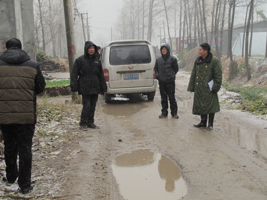 圖片說明:2015年11月份陳召起(右一)與村兩委班子成員冒雪入戶走訪以精準核實貧困戶